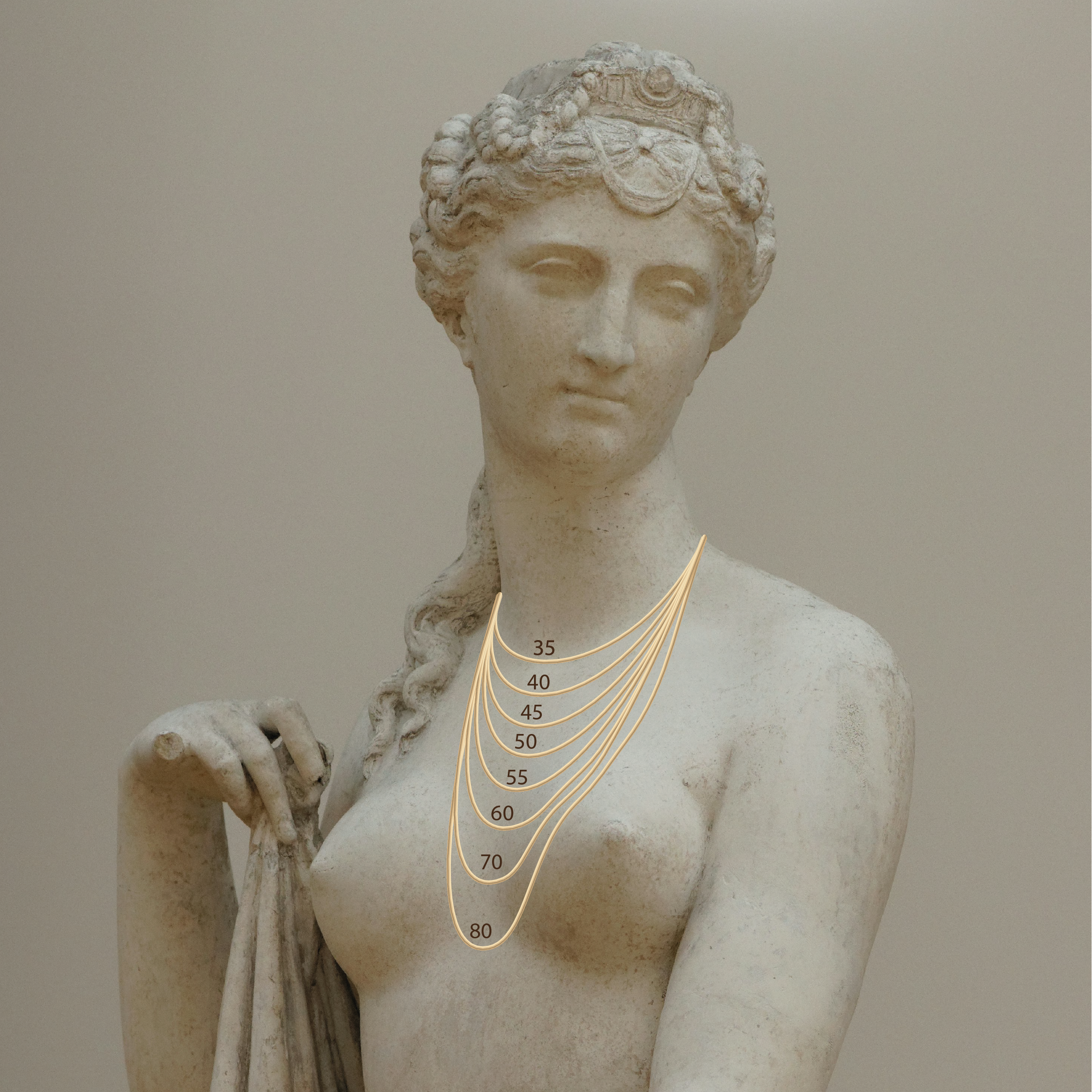 🔹 40 cm (choker) – krótki łańcuszek, który przylega do szyi, idealny do minimalistycznych stylizacji i noszenia warstwowego.